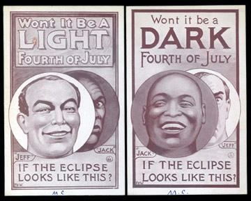 The racism of boxing fans that was stirred up by the African heritage of the Heavyweight Champ is made apparent than in this pair of cards printed in the weeks before the famed Reno bout. Vintage ink on back of "Light" card reads, "Who have you got your money on?" "Dark" reads, "Their (sic) will be no dark Fourth of July. Belive (sic) me." Wrong! Definitely among the most interesting of the extremely limited memorabilia to survive from this fight.