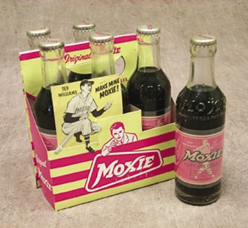 Occasionally you'll see a bottle of this vintage beverage, but to see six is really something. And then, to see six bottles in the original carrier is nothing short of miraculous. All bottles are absolutely like new, with great labels featuring The Kid's famous swing. Cardboard carrier is EX, due only to a few fold running through the die-cut image of Williams. Appearance is stronger than the technical grade.