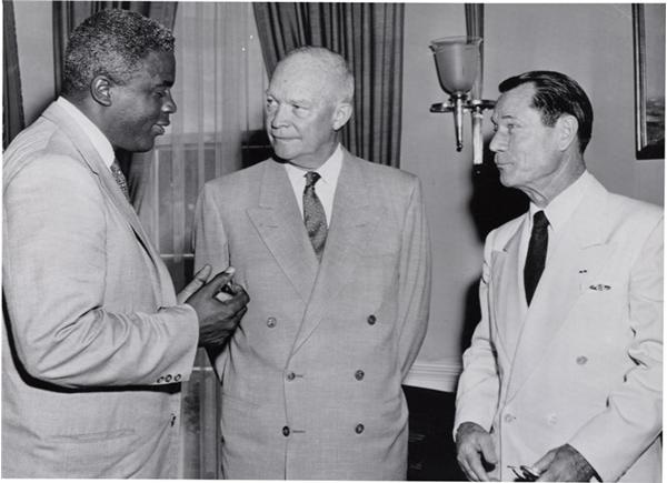 JACKIE ROBINSON (1919-1972)President and Ballplayer, 1957 Jackie Robinson and Joe E. Brown come to the White House to meet Dwight Eisenhower in Jackie’s first year in retirement. 6.5x8.5”; NRMT