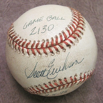 Used actually isn't the right word-abused is more like it. OAL (Budry) ball with the special Ripken 8 stamping is dirty and ugly from its time on the diamond with Major League Baseball's most faithful employee. Sweet spot verifying signature is from Orioles hurler Scott Erickson, who has noted the game count and date on the ball as well. No worries about this record-there's no chance it will ever be topped.