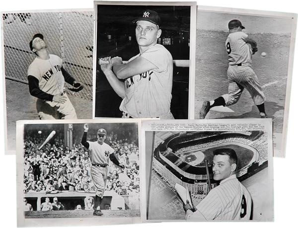 19 vintage newsphotos from his days with the New York Yankees. Includes: stealing home run (1961), home runs #54 and #57, a beauty reading his fan mail during the 1961 World Series, 1962 World Series (2), 1962 All Star Game, with his family, k in 1961 World Series, signing 1961 contract, 1960 slugging sensation, and signing autographs for the kids.