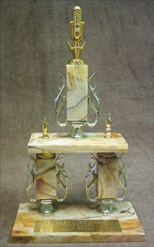 1959 (6x12x22") Here's one of the few personal items ever to find its way into the marketplace from the legendary disc jockey credited with coining the phrase, "Rock N Roll." A marble base with an engraved metal plaque reads: "Golden Mike Award…WINS Radio….Alan Freed." WINS, of course, was the New York City station that hired Freed after he left his "Moondog's Rock 'n Roll Party" radio show in Cleveland. From his first Moondog Coronation Ball in 1952, through his series of Hollywood teenage rock movies, to his renowned concert promotions, and ultimately to his downfall as a scapegoat of the late 50's payola scandal, his tumultuous career was well documented. Freed's undeniable love for the music, its creators, performers, and listeners, can nly be fully appreciated by hearing the enthusiasm his voice exudes in his natural element -- that being, the radio. "Freed estate" is hand written on bottom. LOA states that the trophy had been in the possession of a now-deceased WINS engineer.