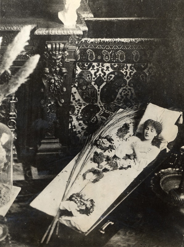 SARAH BERNHARDT (1844-1923)In Her Coffin, 1923 Silver gelatin newsphoto of Sarah Gerhardt as she would have looked in her coffin. She posed for this a few years before her death. She has just died, hence this was published. 6x8”; EX-MT