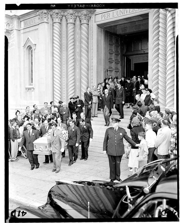 DiMAGGIO FUNERALMother Rose’s Death, 1951 Original negative of the funeral of Mrs. Rose DiMaggio, Joe DiMaggio’s mother. He and his brother Dom are pallbearers. 4x5”; overall NRMT in original envelope