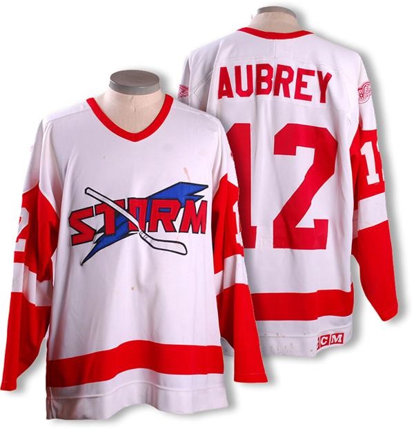 White jersey has name sewn on a plate on the back along with number 12 which also appears on both sleeves. Red Wings logos on both shoulders. Tagging has been removed from the collar due to a large repair that was made by the team. CCM on the hem on the back. Nice use with repairs, pilling, burns, rips, blood, and stick marks.