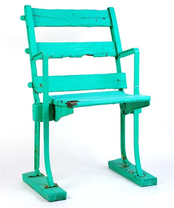 This green Comiskey Park seat has metal sides, metal-hinged wooden slat seat, and straight wooden slats on the seat back. The floor mount is in G condition with some minor cracks in the wood, some chipping and peeling paint and rust spots on the metal sides and base. The rest of the chair is in G/VG condition, again with some paint chips and rust spots on the metal parts. Overall size is 19” wide x 35” high.