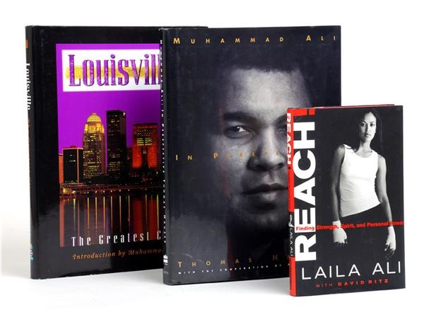 A book titled "Louisville, The Greatest City", has an introduction by one of the city’s most famous sons, Muhammad Ali. The other book is a copy of Thomas Hauser’s "Muhammad Ali In Perspective". One has an authentic signature, the other an autopen signature. Signatures are mint. Also included in the lot is an unsigned book by Ali’s daugther Laila, titled Reach; Finding Strength, Spirit and Personal Power. All of the books are in EX condition.