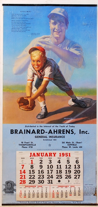 11 x 25'' calendar with Medcalf illustration of Lou Gehrig titled "Atta Boy!" All of the months are intact. EX-MT.