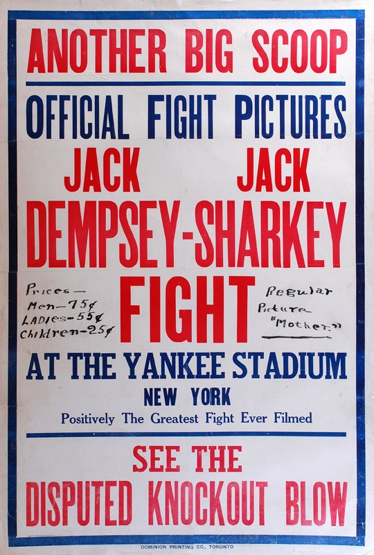 Original Jack Dempsey vs. Jack Sharkey fight film poster dates to 1927. Printed by Dominion Printing in Toronto, Canada. It is on a white paper backround mounted on heavy linen material with still bold red and blue lettering. It reads in all block letters, "Another Big Scoop…Official Fight Pictures…Jack Dempsey-Jack Sharkey Fight...At The Yankee Stadium New York." "Positively the Greatest Fight Ever Filmed." "See the Disputed Knockout Blow". The poster has had some slight restoration and is in overall VG condition with several surface scratches, creases and blemishes. Hand written on the surface in black is a price list; $.75 for men, $.55 for ladies, $.25 for children. Sharkey was beating Dempsey when the fight ended controversially. Dempsey struck some questionably low blows and Sharkey turned to the referee to complain, leaving himself unprotected. Dempsey punched Sharkey's chin, knocking him out cold.