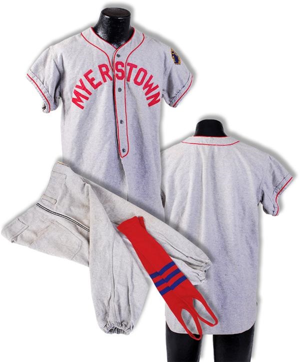 No size or manufacturer's label but 22'' from armpit to armpit jersey and Raleigh Athletic Equip size 34 pants. "Myerstown" is sewn onto the front with a "Ira I. Uhrich Post 55 Myerstown, PA" patch sewn onto left sleeve. Shows some light wear.