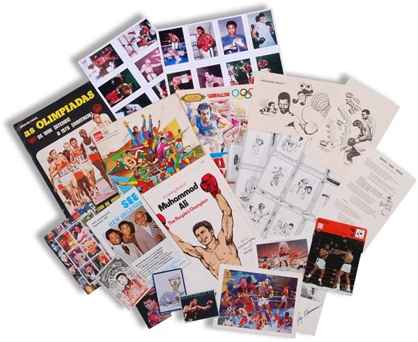 This is, by far, the most comprehensive collection of Ali related cards to ever be auctioned. Remainder of a card collection put together by a dedicated Ali fan that kept everything and anything related to Ali. Lots of rare and scarce foreign material including framed display with Australian and French cards, game cards, British trading cards, trivia game cards, Sportscaster cards (with UK version), lithographed cards, photo cards, Italian sticker albums, patches, postcard sized illustrated cards, 1976 Spanish Bottle Cap Album, rare black studios ethnic culture cards and many, many more. There are also some noncard items such as coloring book, 1978 Guide of New Orleans, several rare postcards, several magnets, commemorative stamp sheets from around the world (46 sheets, really great collection), and much, much more. We would guesstimate that there are 300-400 pieces in this lot, many of which are possibly one of a kind. The most advanced Ali collectors will find much material in here that will enhance even the most comprehensive collection.