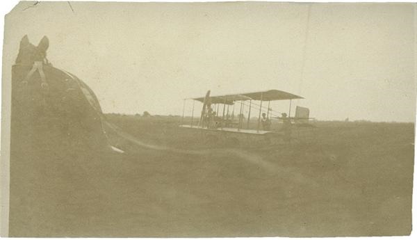 Early aviation circa. 1900 original photo of a propeller airplane. Possibly the Wright Brothers. It appears to be horse drawn as one is seen in the foreground. There are two men visible behind the plane. The sepia toned image is small measuring 4 1/4" x 2 3/8". It is in VG-EX condition and is slightly faded but the surface is smooth and clean.
