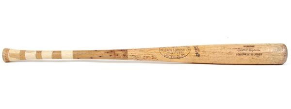 36'' 33 oz. Louisville Slugger 125 H&B moel bat used by during the Oakland Athletics championship years. U1 has been stamped on the knob and Dagoberto Campaneris on the barrell. Cracked at the handle. Shows great use with ball marks and wear throughout.
