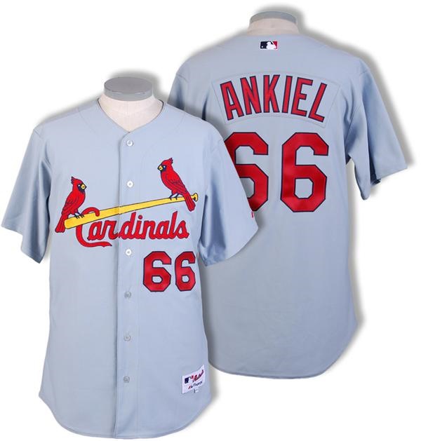 Road, gray jersey worn by Ankiel while he was injured and traveling with the Cardinals in 2003. Majestic Authentic manufacturer's label on the front tail along with size "48" tag beneath. "Cardinals 66" appears across the front with "66" on the back and "ANKIEL" has been sewn into the nameplate. "0062" washing instructions tag has been sewn on the inside seam. Very light use.