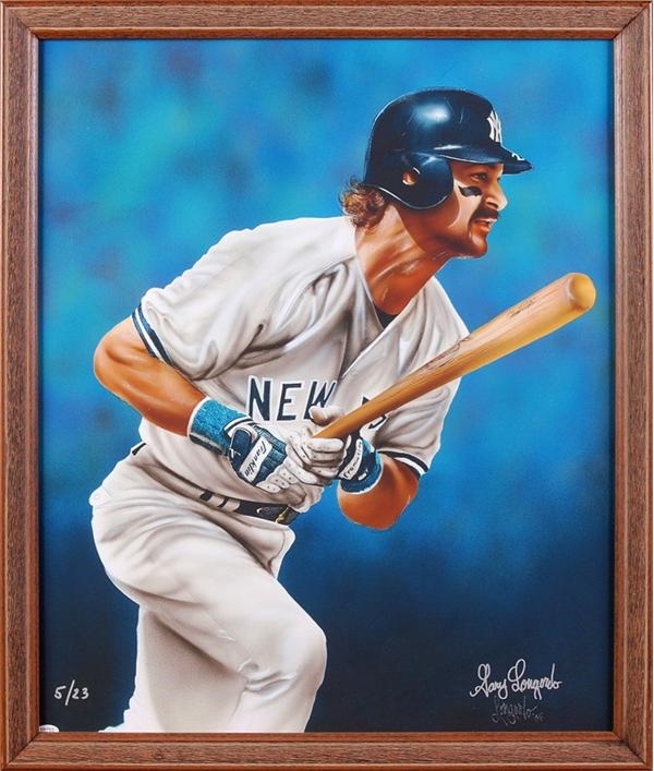 16 x 20'' giclee of the Yankees 1st baseman by artist, Gary Longordo. Limited edition number 5 of 23. Mint. Framed to 21 x 25''.