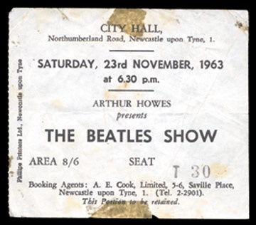 Culled from a fan's scrapbook, the oversized ticket bears tape residue and some staining. 3 1/2" x 3".