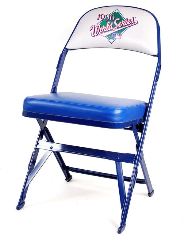 Beautiful blue folding chair used at Riverfront Stadium during the 1990 Series. This seat got to see the Reds win the first two games of the Series on their way to a sweep of the A's. Still in great condition.