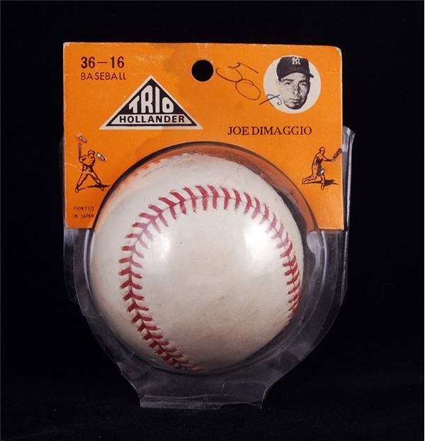 Trio Hollander Joe Dimaggio League Model ball still in the original packaging. The ball has some light toning with the cardboard packaging having some staining.