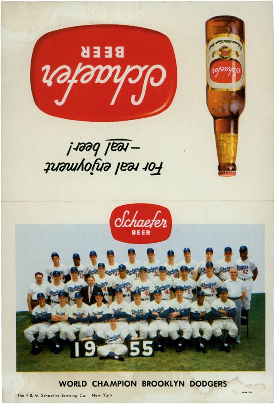 5 1/2 x 4'' table tent issued by Schaefer Beer. The entire 1955 World Champion Dodgers team is pictured. Light staining especially at the bottom otherwise very nice condition.