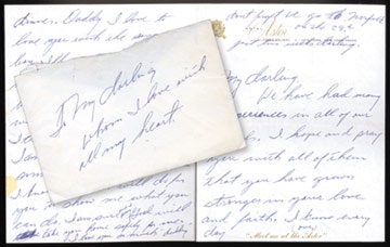 Note penned on Times Square's Hotel Astor letterhead begins like a schoolboy's love note and then ventures into the realm of the X-rated. "…I'll never forget the beautiful motion of your body when you're f**king. When we get that one from Jackie I think I f**k you crazy…" All ink is perfect; letter is signed "Daddy." Includes original envelope which is not postmarked or addressed (perhaps sent inside a larger parcel), but is marked, "To my darling whom I love with all my heart."