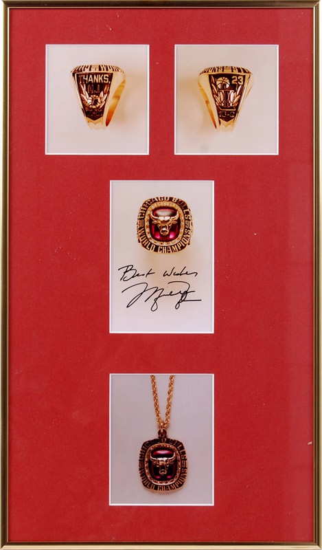 Four photos of the 1990-91 ring and pendant that Michael Jordan had made for his friends and teammates. One photo is signed in 9/10 black Sharpie "Best Wishes, Michael Jordan." All four photos are framed and matted toghether.