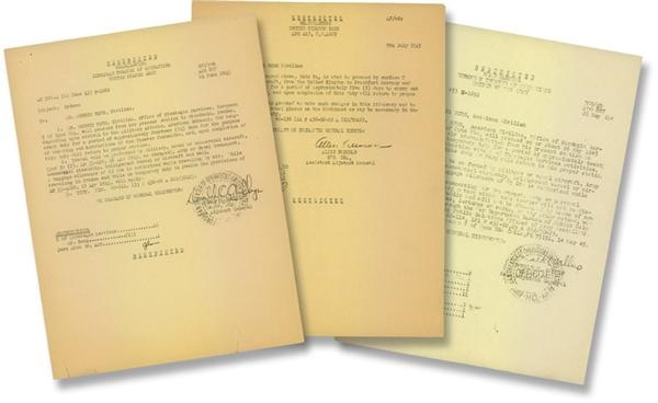 Three different 8 x 10 1/2'' orders marked "Restricted" from 1945 to Moe Berg. The orders have Berg heading to Sweden, Italy and France. A vertical fold line through the center of one of the orders along with some tiny tears and minor toning otherwise fine.