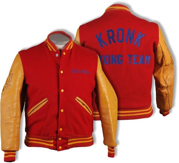 Red and gold leather and wool size 36 Delong jacket worn by Emanuel Steward. Steward has signed the right sleeve "To Peter, This is an original Classic (1976) "I'm Jealous" Emanuel Steward" in black ink. "KRONK BOXING TEAM" has been sewn on the back in blue letters. Shows some use with some light staining but still very nice.