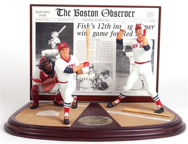 Cooperstown Collection Danbury Mint Reds vs. Red Sox game 6 figurine display. It includes (3) lifelike figurines each at 6" in height. One depicts Fisk swinging the bat, and another guiding the ball with his arms motioning for it to stay fair. The third shows Bench glove up waiting for the pitch that never reached his glove and ended up going over the green monster. Each is attached to a wood base with the above the fold Boston Observer headline & article display making for quite an historic and nostalgic display. EX.