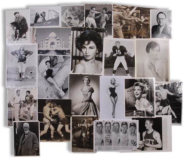 A huge collection of wire (90%) and laser wire (10%) photos from the San Francisco Examiner archives. It appears the majority of the photos are from the 1950s and earlier but all decades are represented well.The subjects of the photos range with a good amount of celebrities some military, sports, and historical. Some of the items included are Kerwin Mathews, Carole Mathews, Communists, Bank of America, General Pagalos, The Mary Jane Girls, Bruce Weitz, Larry Storch, Mae Sagan, Holly Hunter, and more. The photos average 8 x 10'' in size but some are small and some are bigger. Editor's crop marks along with some general wear so condition ranges from G to EX with most being VG to EX. Days of wonder and discovery are to be found perusing through this immense collection of images that chronicle 20th century celebrity history.