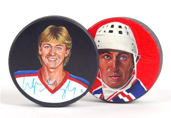 Beautifully hand painted and signed by artist John Giancaspro 1999 NY Rangers Wayne Gretzky headshot original puck by fotopuck. The detail in the paint is incredible for such a small painting surface. Puck's verso has a partially worn "Official All-Star Cafe" decal. Condition on the front painted side is EX-MT. The second puck in this lot is a hand painted by artist Josh Edmonds 1986 Edmonton Oilers Wayne Gretzky headshot original puck capturing "The Great One" in a more youthful light. The condition is EX-MT with nothing on the verso save for a small piece of scotch tape. Gretzky has autographed over his jersey in blue ink rating a 9 out of 10.