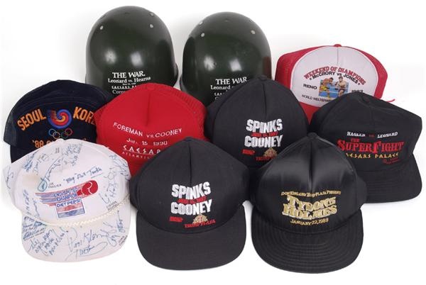 1) White, Speedway adjustable size cap has been signed by 14 boxing greats. Includes: George Foreman, Joe Frazier, Frank Bruno, Roberto Duran, Azuman Nelson, Evander Holyfield, Donny Lalonde, and more. Signatures rate 8 to 10 out of 10. Cap has some staining. 2-3) Black, adjustable size cap for the Michael Spinks v James Cooney fight in 1987. 4) Black, adjustable size cap for the Marvin Hagler v Sugar Ray Leonard fight form 1987 titled "The SuperFight". 5) Black, adjustable size cap for the Mike Tyson v Larry Holmes fight in 1988. 6) White, red adjustable size mesh cap for the McCrory v Jones fight in 1983. 7) Red, adjustable size mesh cap for the Foreman v Cooney fight in 1990. 8-9) Green, plastic army helmets for the Sugar Ray Leonard v Tommy Hears fight in 1989 titled "The War". 10) Blue, adjustable size mesh cap for the 1988 Olympics in Seoul Korea. The caps rate EX-Mint to Mint with the exception of the signed cap which has some staining.