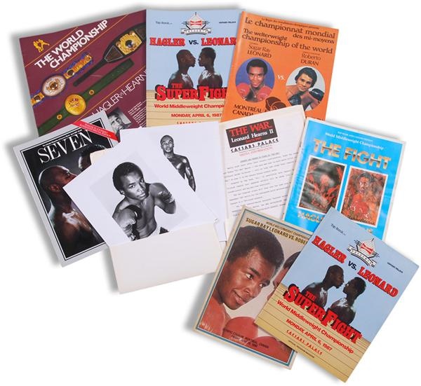 1) 1976 XXI Olympic Boxing program with Sugar Ray Leonard. Near Mint to Mint. 2) 1980 Sugar Ray Leonard v Roberto Duran fight program. 3-5) 1987 Marvin Hagler v Leonard program. 6) 1989 Leonard v Tommy Hearns press kit. 7) 1982 Wilfred Benitez v Hearns program. 8) 1985 Hagler v Hearns program. 9-10) 1987 Hagler v Leonard program. 11) 1980 Leonard v Duran program. 12) 1989 Leonard v Hearns media program. 13) 1989 Leonard v Hearns fight program. 14) 1982 Hagler v Leonard press kit. The condition varies and ranges from VG to Mint with most being EX or better.
