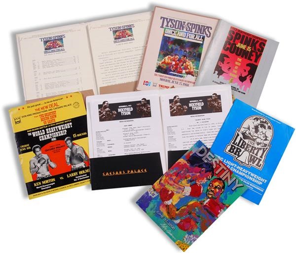 1-2) June 27, 1988 Mike Tyson v Larry Spinks press kit. 3) November 8, 1991 Evander Holyfield v Mike Tyson press kit. 4) June 15 program for the Spinks v Gerry Cooney fight. 5) Complete press kit for the Ken Norton v Larry Holmes fight on June 9, 1978. 6) 1988 The Boxing Writers Association of America 63rd Annual Dinner program. 7) August 7, 1982 program for the Dwight Braxton v Matthew Saad Muhammad fight. 8) 1990 World Boxing Association Convention program. 9) June 2nd, 1979 program for the Tate v Knoetze fight. 10) July 8th, 1989 The Centenary of the Last Bare-Knuckle Fight for the Heavyweight Championship of the World program. 11) December 2, 2000 program Felix Trinidad v Fernando Vargas fight. 12) June 17, 2000 program for the Oscar De La Hoya v Shane Mosley fight. 13) 1979 the National Veterans Boxers Association convention program honoring Joe Louis. 14) 1979 54th Annual Boxing Writers Association program. 15-16) 1989 64th Boxing Writers Association of America program. 17) 1996 Lonsdale dinner program honoring Leroy Neiman. Condition ranges from G to Mint with most being EX or better.