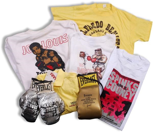 1) Blue, size medium t-shirt that reads "Middleweight Champions VITO" with a picture of Antuofermo across the front. 2) Yellow, size M polo shirt that reads "CAESARS PALACE - HAGLER/LEONARD" on the right breast. 3) White, size L t-shirt for the Michael Spinks v George Cooney fight. 4) Black, size XL t-shirt that reads "I'm a Heavyweight at Harrah's". 5) White, size XL Lonsdale t-shirt that shows two old time grapplers on the front. 6) White, size L Lonsdale sweatshirt with a "Iron Man" Mike Tyson cartoon photo on the front. 7) Yellow, size M t-shirt that reads "Wilfredo Benitez World Champion" on the front. 8) White, size L Lonsdale sweatshirt with Joe Louis on the front. 9) Gold Everlast left-handed glove that has "EyeSaver Another New York State Athletic Commission first!" stamped on the glove. 10) Pair of "Silver Gloves '75" Everlast gloves with a stamped signature from Joe Frazier. The items rate VG with some staining to Mint with most of the items EX or better.
