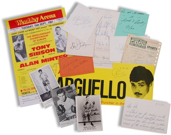 A nice collection of cuts, photos, index cards and more have been signed by 40 boxers. Includes: Pender, Espada, Benitez, Winstone, Hagler, Pastrano, and more. Signatures rate Near Mint to Mint with most being Mint. The items rate VG to Mint wiht most being EX or better.