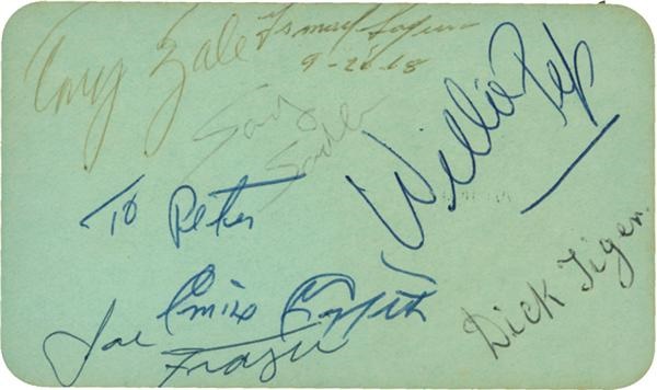 3 7/8 x 2 1/4'' cut has been signed by 7 boxing greats. Includes: Dick Tiger, Sandy Saddler, Emile Griffith, Ismael Laguna, Joe Frazier and Tony Zale. The signatures rate Near Mint to Mint. All were signed in person in 1968.