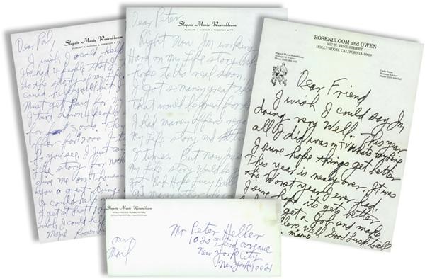 Three handwritten letters with two on "Slapsie Maxie Rosenbloom" letterhead while the other is on "Rosenbloom and Owen". The two letters on "Slapsie" letterhead are regarding Rosenbloom's life story where he turns down an offer for someone to write his story. He expresses in the second letter "But now I'm sure that my life story would be great as I got Bob Hope, Lucy Ball Crosby and many other who are my dear friends." The third letter Rosenbloom writes "It was the worst year I ever had. I sure hope its gets better so I can get a job and make a few dollars." The ink rates Mint overall and Rosenbloom as signed two of letters "Maxie" and one "Maxie Rosenbloom". Usual fole lines with a tiny spot of toning or two. One original mailing envelope is included.