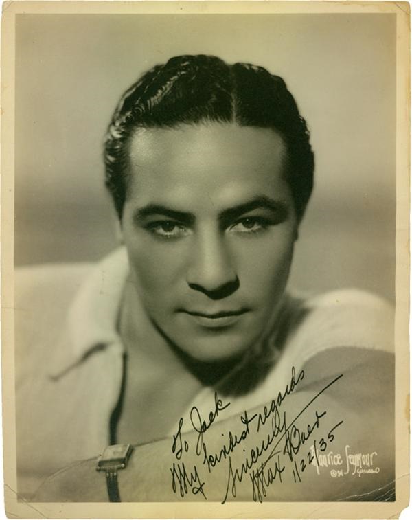Nice 8 x 10'' black and white portrait photo has been signed in Mint black ink by Baer. He has signed and inscribed "To Jack My kindest regads Sincerely Max Baer 1/22/35". A few light to moderate creases along the corners with some mild toning and minor staining.