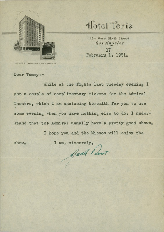 Dated February 17, 1951, 5 1/2 x 8'' Hotel Teris stationary has been signed in Mint ink by Jack Root. Two usual fold lines with light toning overall Near Mint.