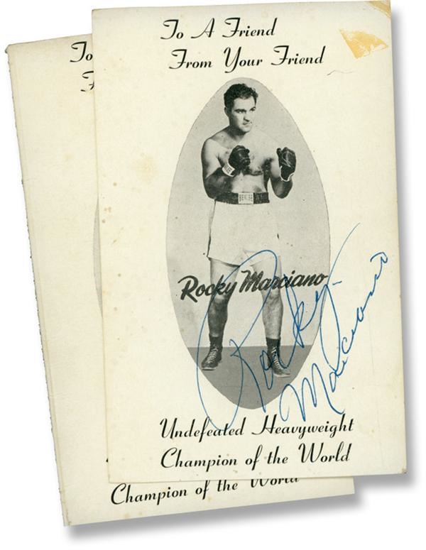 3 3/4 x 5 3/4'' black and white postcard has been signed in Mint blue ink by Marciano. The postcard is unused. Light staining overall VG to EX. An unsigned pamphlet with the photo from the postcard on the cover.