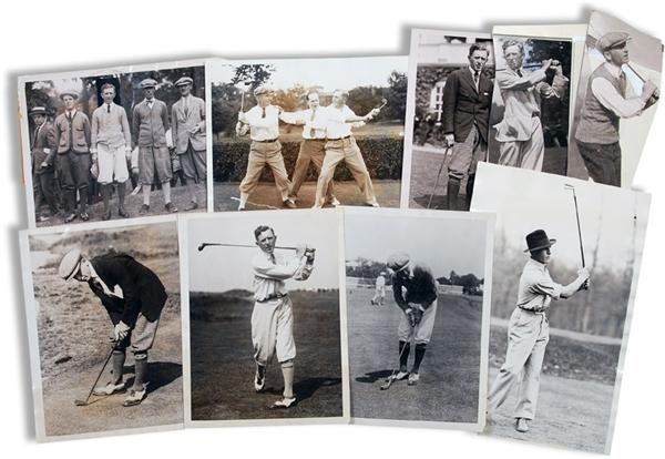 Dapper photo collection of sharp dressed golfer Jock Hutchinson and his son Jock, Jr. Includes photos dating mostly from the early 1920's of Jock and 1030's thru 1950's of Jock, Jr. Sizes range from 3" x 7" to 8 1/2 x 10". Conditions range mostly from GD through VG with many having been trimmed and newspaper artist enhanced as was the norm in the 1920's.