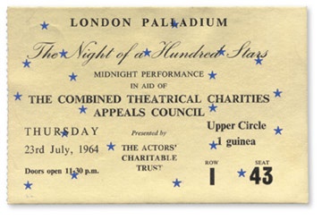 In addition to performing, the group appeared in a "flying" ballet sketch requiring them to be hoisted above the stage wearing harnesses. Most Beatles afficianados have seen the flying Beatles in well-known photos from this event. Among the 100 participants at the midnight charity event: Laurence Olivier, Judy Garland, Wilfred Brambell (Paul's grandfather in "A Hard Day's Night"), Jane Asher (Paul's girlfriend), Boris Karloff, Zsa Zsa Gabor, Hayley Mills, Shirley Bassey, Roger Moore. A large, high-lustre gold ticket peppered with blue stars. Rarely seen! VG. 5 1/4" x 3 1/2".
