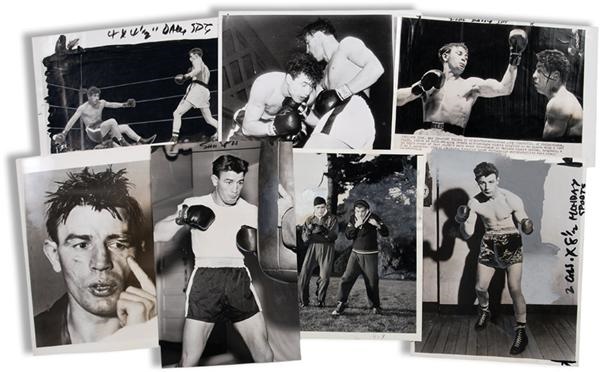 Collection of Pierre Langlois photos (24) from the archives of the SF Examiner. They depict the French boxer in fight action dating from the early and mid 1950's. Most are 8" x 10" and conditions range from VG to EX-MT. Some have newspaper artist edits and most have captions either on the front or verso.