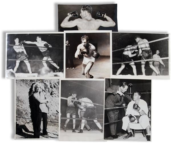 Collection of original 1930's SF Examiner archive photos (15) of boxer Art Lasky. They range in size from 5" x 5" to 8" x 10" and average VG condition. Most have caption sheets taped to the verso and some have been newspaper artist edit enhanced or marked.