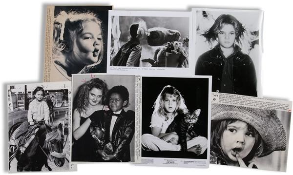 A nice mix of movie stills and wire photos (a few are laser wire photos) of the star from 1979 to the 1990s. They average 8 x 10'' in size and movies include E.T., Firestarer, Cat's Eye, Bad Girls, Ever After, Poison Ivy, Wedding Singer, and more. The other photos show Barrymore with Emmanuel Lewis, her & Dick Ebersole after she hosted SNL, horseback riding, sitting with her mother, etc. The photos rate VG to Mint with most being EX or better.