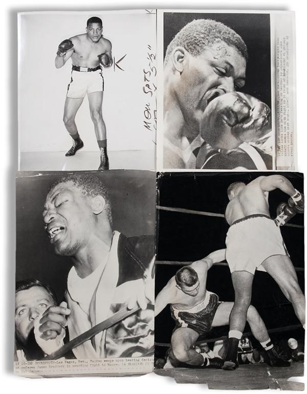 A nice mix of action, portrait and candid shots from the 1950s and 1960s. The photos range from 7 x 7'' to 8 1/2 x 12'' with most averaging 8 x 10''. Valdes is shown with "The Bongo King" Miguelito Valdez, knocking out Bob Woodall, fighting Johnny Holman, Jack Flood, Alex Miteff, James Parker and more. The condition ranges from P/G to Near Mint with most being EX-Mint.