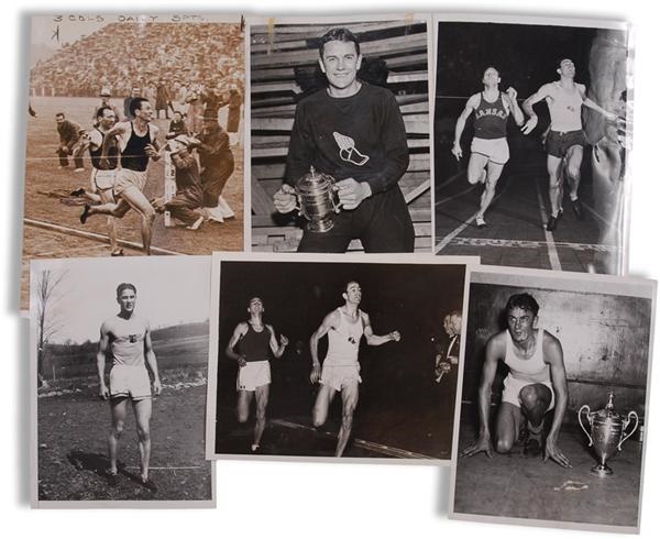Olympic Track and Field champion Gene Venzke represents in this photo lot (27) from the San Francisco Examiner archives. Photos date mostly from the 1930's and range in size from 5" x 6" to 8 1/2" x 11". Some have been trimmed, marked and or enhanced by the newspaper artists. Conditions range from VG to EX plus with many EX.