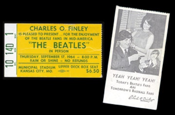 The reverse of this stub features Kansas City Athletics owner Charlie Finley wearing a Beatle wig and exclaiming "today's Beatles fans are tomorrow's baseball fans". Ex.