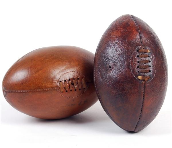 Two very early Melon style footballs. No manufacturer's stamping on either but the original laces are attached. Both show little to moderate wear with the darker brown having some very light cracking on the leather. Overall EX/EX+ condition.