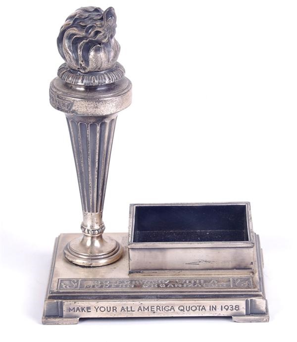 8 1/2'' tall metal business card holder with an Olympic torch and a place for your business cards. Right below the holder, it reads "Go Forward With A Modern Organization". On the front, "Make Your All America Quota In 1938". A few minor scratches and staining overall EX.